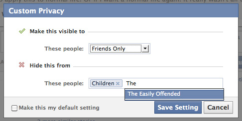 Did you know that with Facebook’s new privacy features its possible to have full control over who views your status messages and who doesn’t, down to the finest finessing? Considering the increase of children friends on Facebook I think its really wise to have at least a “Children” exclusion list to select when making risque updates.